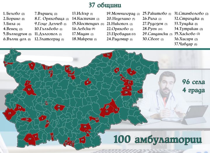Новите амбулатории ще бъдат разкрити в 96 села и 4 града и ще се предоставят за безвъзмездно ползване на медицински специалисти чрез договори със съответните общини. Така се създават условия хората да получават първична медицинска помощ по-близо до мястото, където живеят.