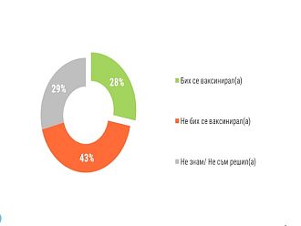 43% от българите не биха се ваксинирали. Да си сложат ваксинa срещу COVID изразяват готовност далеч по-малко - 28% или над милион и половина българи. Това става ясно от проучване на „Тренд“ по поръчка на вестник „24 часа“, посветено на нагласите на българите спрямо ваксинирането. То е реализирано в периода между 12 и 19 януари 2021 г. чрез интервюта "лице в лице" сред 1008 души на възраст 18+.