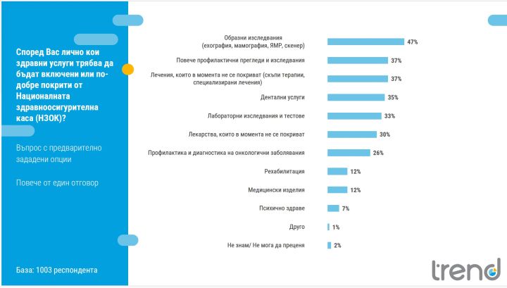 „Критичната оценка на гражданите към здравната система се проявява ясно при въпроса за обхвата на услугите, които покрива Здравната каса. Мнозинството от анкетираните смятат, че пакетът услуги, финансиран от НЗОК, не отговаря на реалните нужди на пациентите. Най-често посочваните услуги, които според хората трябва да бъдат по-добре покривани, са образните изследвания, профилактичните прегледи, лабораторните изследвания и лечението, което в момента остава извън обхвата на публичното финансиране.
